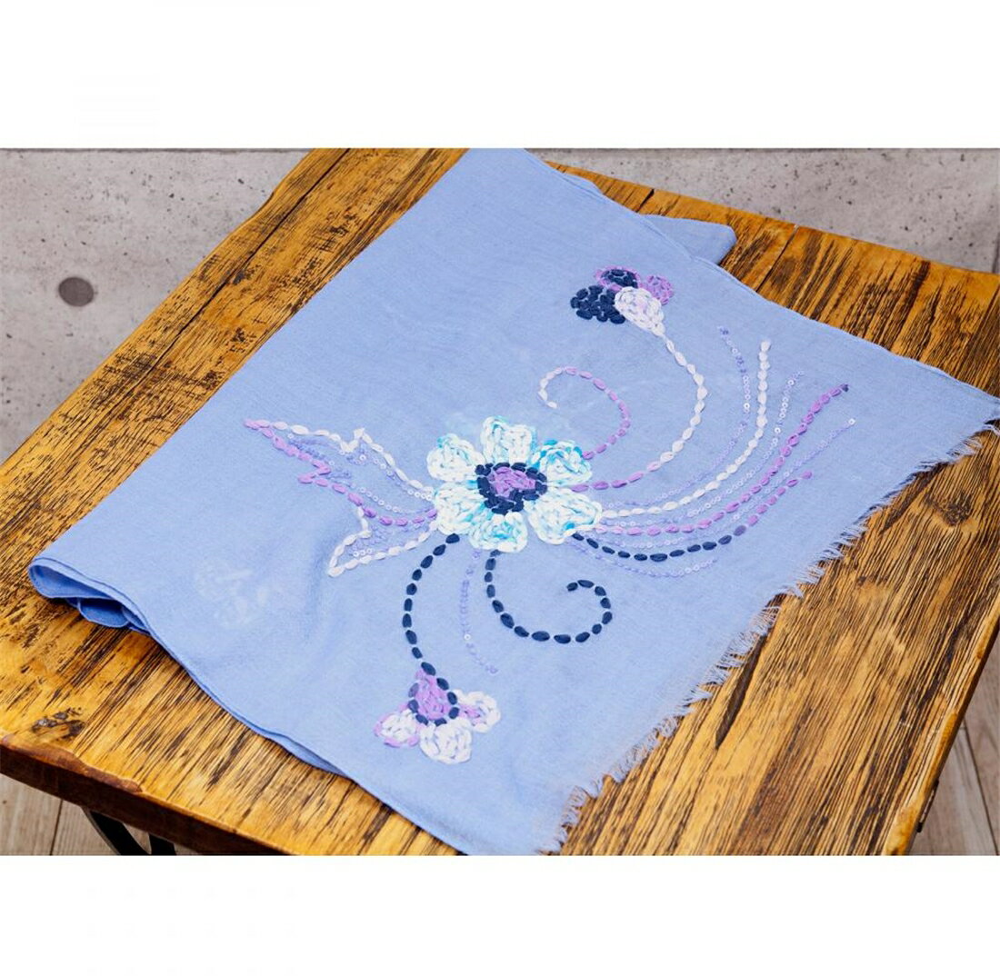 薄手のウール生地に立体感のある刺繍が施された淡い水色のストールです。