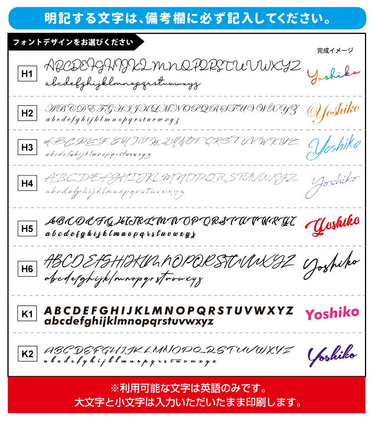 シンプルで使いやすく、ゴシックから筆記体までお好きな名入れをお選び下さい。