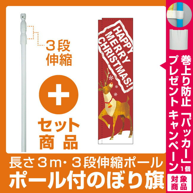 【セット商品】3m・3段伸縮のぼりポール(竿)付 スリムのぼり ハッピーメリークリスマス 柄:トナカイ (5074)